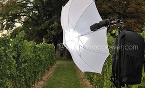 Pas de flash studio ici, mais un flash Nikon SB-900 dirigé vers un parapluie translucide, le tout assemblé sur un support prévu à cet effet, monté sur un trépied, avec mon sac photo comme contre-poids.
